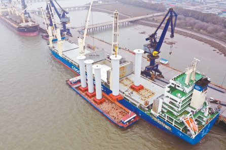 3月16日12时,在江苏常熟兴华码头,中远海运特运多用途船天惠轮顺利将5件高达28米的筒转帆卸到驳船上,标志着公司2021年首个进口全程物流项目圆满完成。按照客户要求,这种新型船用节能设备必须全程直立运输。中远海运特运相关项目组经过仔细研究,为客户量身定制了从生产基地驳船接货后到海港直接过驳到大船的装运方案,并以专业的技术与周到的服务确保方案落地,得到了客户的高度赞扬。 郝建强 摄影报道
