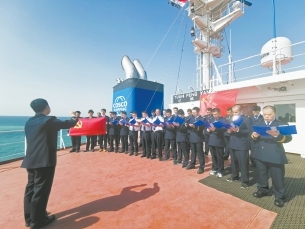 近日,航行在印度洋的远鹏洋轮上,一曲嘹亮的《歌唱祖国》在甲板上回荡。这是该轮船员正在开展“印度洋上歌唱祖国,献礼建党100周年”主题党日活动。(方明晓)