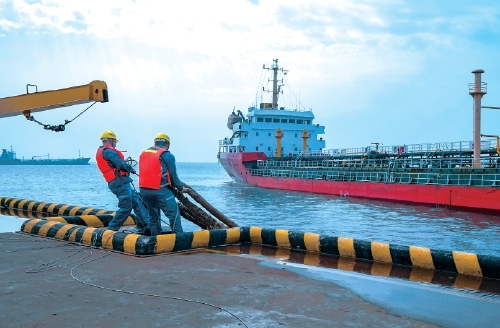 图为中国船舶燃料连云港公司员工在码头为内贸油轮带缆作业。王向阳摄