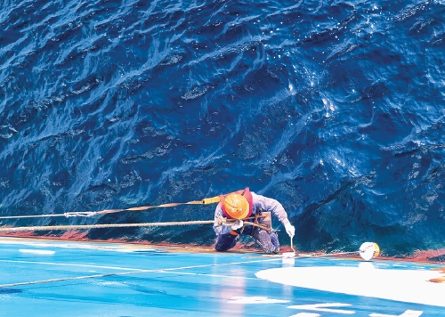 图为中远海运集运所属中远惠灵顿轮组织船员开展船壳水尺线涂描作业。(吴博涛摄)