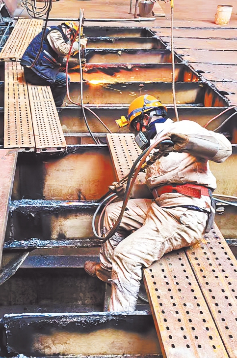 人勤春来早。尽管近日上海的天气迎来一波“透心凉”,但也架不住上海中远海运重工春节复工后生产现场的“热情似火”。图为船厂职工正在船台上进行焊接作业。