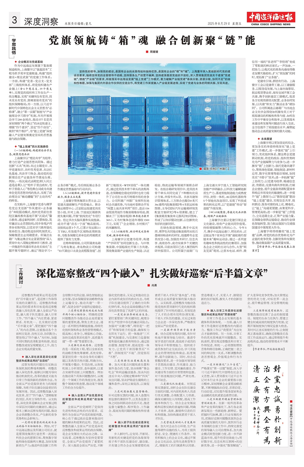 工作探讨 巡察整改和成果运用是巡察的“后半篇文章”,是巡察工作取得实效的关键所在。巡察整改和成果运用的要求和目标是将巡察整改融入深化改革、融入全面从严治党,融入班子队伍建设、融入日常工作。“四个融入”内在贯通、紧密联系、有机统一。扎实做好巡察“后半篇文章”,要把握好“四个融入”的内在逻辑,注重推动各个方面相互促进、良性互动、协同配合;要坚持以“四个融入”为目标,加强不同时期的改革配套和衔接,使巡察整改成效呈现螺旋式上升,助力企业实现高质量发展。 ◆融入深化改革是深化巡察整改和成果运用的“总目标” 巡察发现的问题往往反映出体制机制的弊端和障碍。将整改融入深化改革,能够以问题为导向推动机制优化,改革的推进又能为日常工作提供新的思路和方法,为全面从严治党提供更有力的制度保障,为班子队伍建设创造更好的发展环境。因此,巡察整改融入深化改革,居于“四个融入”逻辑框架的顶层,具有主导性作用。从实践看,深化改革是解决企业发展过程中深层次问题的关键途径,通过从根本上解决巡察发现的问题,推动企业资源整合优化,产生新的竞争优势和社会影响力。 一是将巡察整改的成效与企业的奋斗目标相结合。例如,对于中远海运散运及所属公司而言,就是要围绕集团打造世界一流航运科技企业的愿景目标,聚焦数字智能和绿色低碳两大赛道,加快发展新质生产力;推进科技创新工作和全球数字化供应链、绿色智能航运业发展;坚决保障国家战略物资海上运输安全,推动共建“一带一路”,促进全球产业链供应链稳定。 二是将巡察整改的成效与提升两个核心相结合。明确将巡察问题整改作为推动企业高质量发展的重要机遇,聚焦主责主业,通过一系列管控和赋能措施,持续优化组织架构和业务经营管理模式,提高核心竞争力,增强核心功能,加快完成改革深化提升、高质量共建“一带一路”等重要任务。 三是强化系统思维。巡察整改是一项系统工程,要以全面系统的战略思维统筹兼顾、系统安排,紧紧扭住牵一发动全身的关键问题以及典型共性问题,明确方向,开展集中整治、专项治理,从体制机制上分析原因、查补漏洞,以重点突破带动面上问题整改。例如在推动某个具体问题整改时,从规范一个领域工作的角度出发,推及整个领域对照查摆,推动某个领域工作的全方位提升。 ◆融入全面从严治党是深化巡察整改和成果运用的“政治保障” 全面从严治党阐明了党保持先进性和纯洁性的内在要求。巡察作为全面从严治党的制度利器,核心在于通过政治监督来推动问题的解决和成果的运用。因此,巡察整改融入全面从严治党是深化巡察整改和成果运用的政治保障,是企业发展壮大的必由之路。从实践看,巡察整改为坚持党要管党、全面从严治党提供了重要抓手。深入推进全面从严治党,不断强化党的建设,又反过来推动在企业内部形成良好的政治生态,为班子队伍建设提供了正确的方向和纪律约束,为企业高效稳健运行和深化改革营造了风清气正的环境。 一是突出涵养好政治生态。紧盯重要部门和关键岗位,梳理分析生产经营中存在的廉洁风险点;加强对“关键少数”,特别是“一把手”和领导班子的监督,确保权力在阳光下运行。把一体推进“三不腐”机制建设,与完善权力监督制度和强化廉洁教育相结合,通过惩治震慑、制度约束、提高觉悟一体发力,让党员干部因敬畏而“不敢”、因制度而“不能”、因觉悟而“不想”。 二是保持惩治腐败高压态势。加大对重点问题线索处置和案件查办的力度,坚决斩断“靠企吃企”和利益输送链条,坚决纠治违反中央八项规定精神和“四风”突出问题,坚决铲除滋生腐败的土壤和条件;深化以案促改,以案促治。 三是巩固拓展大监督格局。针对巡察反馈的问题,深入查摆内部监督的薄弱环节,以及各监督主体之间协同联动存在的不足,推进监督力量整合、程序契合、工作融合,提高发现问题的精准性和穿透力。 ◆融入班子队伍建设是深化巡察整改和成果运用的“组织保障” 步入新时代,应变局、育新机、开新局的关键是把党的各级领导班子和干部队伍建设好、建设强。只有建立符合企业发展需要的高素质干部人才队伍“基本盘”,才能形成企业高质量发展的强大推动力。从实践看,巡察整改为推动各级党组织贯彻新时代党的组织路线提供了针对性的建议,有效促进了人才的合理布局和协调发展。干部人才队伍的建强,又反过来助力企业进一步深化改革,严格落实全面从严治党要求。 一是提升领导班子能力素质。结合巡察发现的问题,有针对性地开展领导能力培训。邀请专家学者进行授课,提高班子成员的领导水平和管理能力。组织班子成员参加行业交流活动,学习其他企业的管理经验和做法,拓宽视野,提升创新能力。同时,结合巡察整改要求,进一步加强对领导班子思想政治建设、作风建设、能力建设、工作实绩、党风廉政建设、作风建设等方面的日常管理和监督,对干部违规违纪问题,严肃处理,绝不姑息。 二是强化队伍建设。对照巡察反馈意见,剖析企业在队伍建设方面的问题,对内部机构和人员进行优化调整,合理配置人力资源,确保关键岗位人岗相配,提高工作效率和执行力。结合企业发展战略和巡察反映的普遍性问题,明确人才培养、选拔、